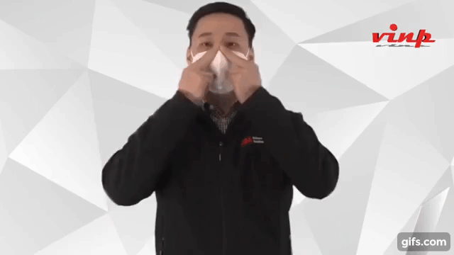 Bước 5: Đặt tay lên toàn bộ khẩu trang và thở ra thật mạnh. Nếu khẩu trang phồng lên tức là đã vừa với khuôn mặt của bạn. Ngược lại, nếu bạn cảm thấy có khí thoát ra, hãy điều chỉnh vị trí của khẩu trang và thanh kim loại.