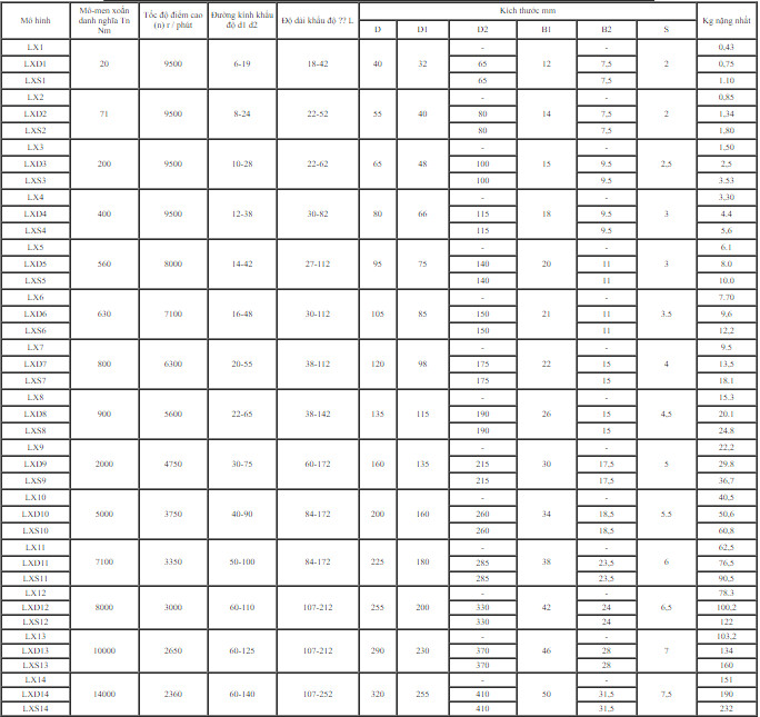 - Đường kính lỗ trục (d1, d2): 6mm - 140mm