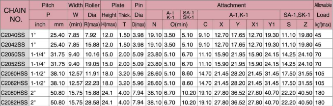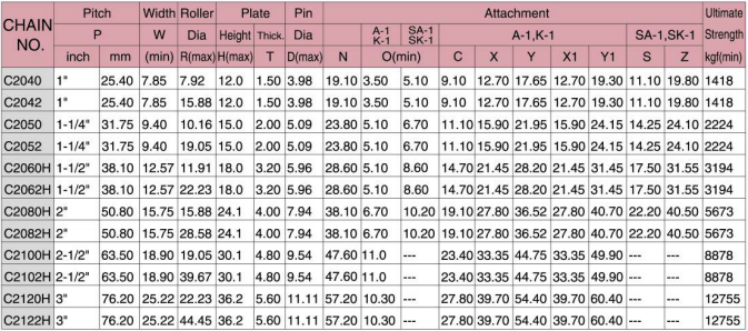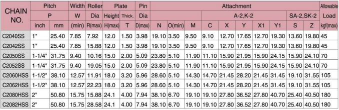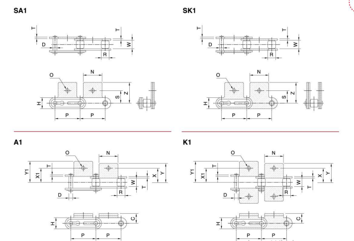 Phụ kiện đính kèm xích con lăn bước đôi bao gồm các loại A1 / A2, K1 / K2, SA1 / SA2 và SK1 / SK2.