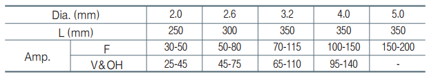 Đường kính que hàn: 2.0/ 2.6/ 3.2/ 4.0/ 5.0mm