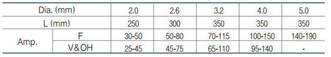 Đường kính que hàn: 2.0/ 2.6/ 3.2/ 4.0/ 5.0mm