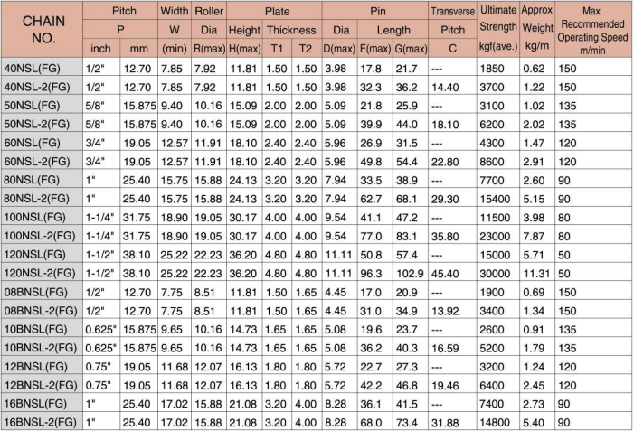 Xích con lăn tự bôi trơn dòng NSL có hai phiên bản FG (dải nhiệt độ từ -10 - 145 độ C) và FGH (dải nhiệt từ -20 -220 độ C).