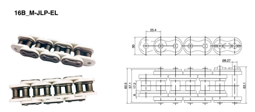 Xích không đánh dấu 16B_M-JLP-EL thường được sử dụng để vận chuyển các con số hoặc thành phẩm có trọng lượng trung bình mà không để lại vết xước hoặc hư hỏng trên bề mặt.