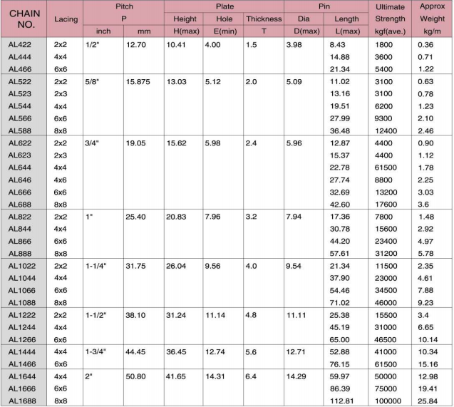 Xích lá loại AL chỉ bao gồm các tấm và chốt từ xích con lăn tiêu chuẩn ANSI.