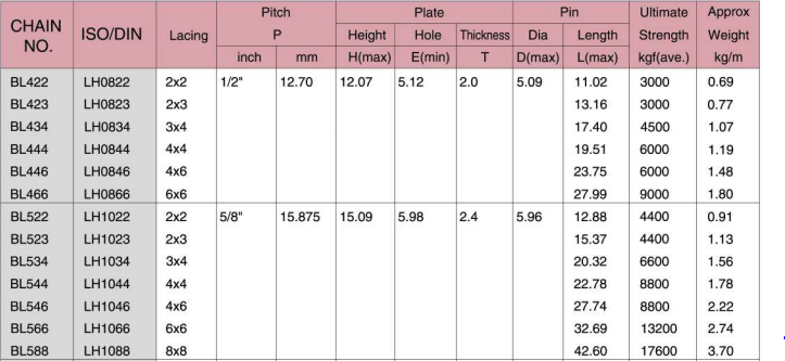 Xích lá loại BL được sản xuất theo tiêu chuẩn ASME và ISO có các tấm dày hơn và các chốt lớn hơn.