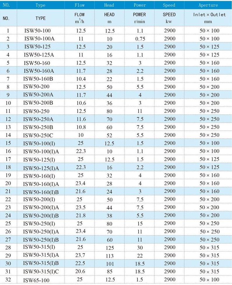 Bơm ly tâm một tầng ISW thích hợp sử dụng cho cấp thoát nước công nghiệp và đô thị, cấp nước điều áp tòa nhà cao tầng, tưới vườn tưới tiêu, điều áp chữa cháy, vận chuyển đường dài, chu trình làm lạnh, phòng tắm và điều áp chu trình nước lạnh và ấm khác và phù hợp với thiết bị.
