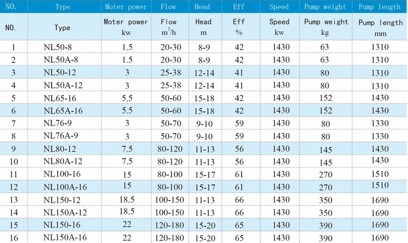Máy bơm bùn nước thải NL là loại máy bơm vận chuyển các nồng độ khác nhau của nước biển, nước muối và dung môi hữu cơ.