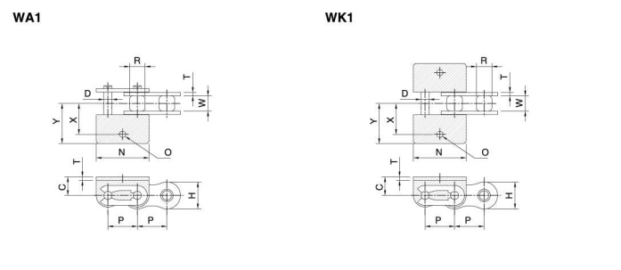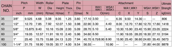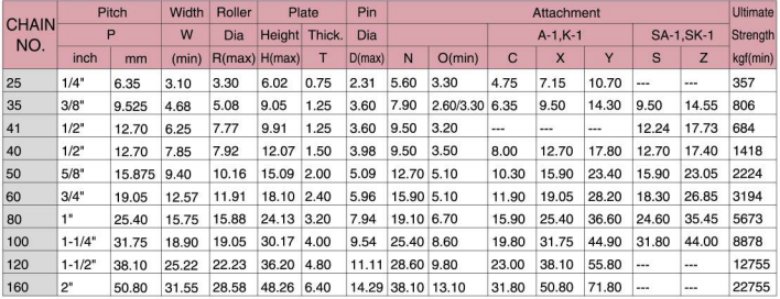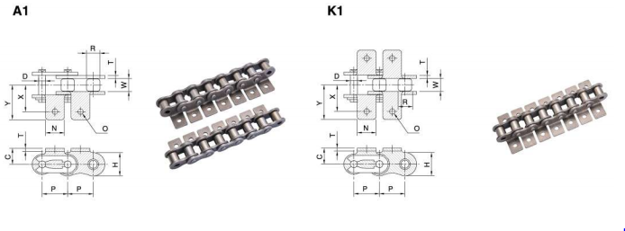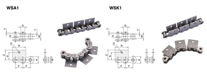 Các phụ kiện xích con lăn tiêu chuẩn bao gồm A / K, SA / SK và các loại phụ kiện đường viền rộng WA / WK, WSA / WSK.