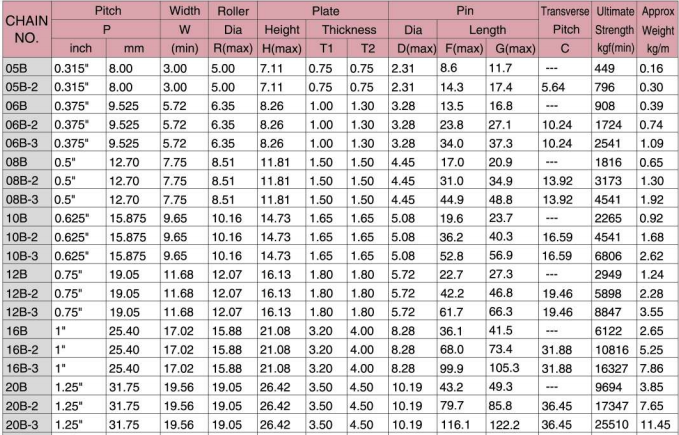 Xích con lăn BS được sản xuất theo tiêu chuẩn ISO có kích thước từ 05B đến 56B ở dạng sợi đơn, sợi kép và sợi nhiều sợi.