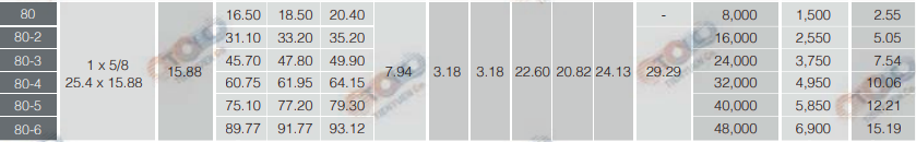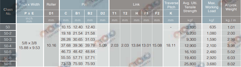Được sản xuất với các loại xích đơn và xích nhiều dãy theo tiêu chuẩn, có đầy đủ kích thước mã xích gồm 25, 35, 40, 50, 60, 80, 100, 120, 140, 160, 180, 200, 240.