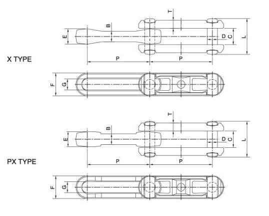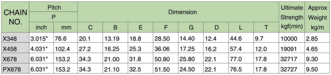 Xích đinh tán rèn thả kiểu X còn được gọi là xích xe đẩy rèn thả, được thiết kế để uốn cong theo chiều ngang trên bán kính ngắn hơn và có thể được lắp ráp và tháo rời mà không cần sử dụng công cụ để dễ dàng lắp đặt và bảo trì.